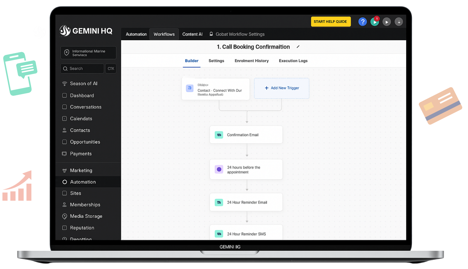Gemini HQ keeps your clients engaged, supported, and coming back. Your system handles conversations, follow-up, reminders, and customer touchpoints automatically, so nothing slips and every client feels taken care of. With Gemini HQ, you can: